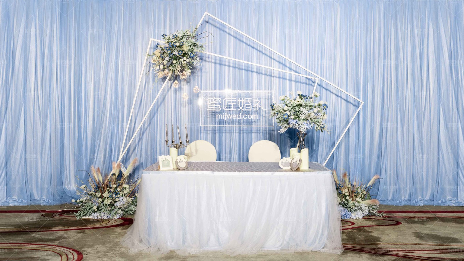 签到台:简约大方,不规则铁艺讲述简约深情;不规则铁艺纯手工制作,斜角花艺点睛之笔,双层素色纱幔清新空灵。