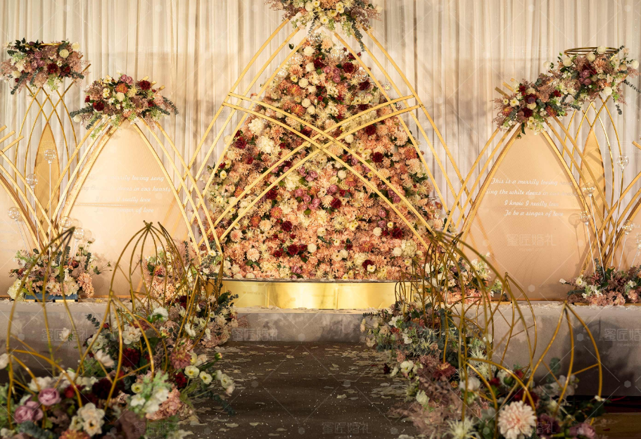 仪式通道:细碎的珠光闪烁,在金色叶片间舞出灵动趣味;流沙珠光地毯,个性金属叶片俏皮活泼,灵动花枝超高仿真。