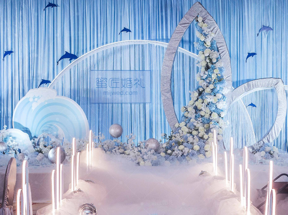 灵感源自南太平洋“阿达拉”人鱼传说,以清新海洋蓝为主色调,定制桁架鱼尾配合欢悦涌动的海豚与海浪,辅以星星点点银色球饰点缀其中,银光微闪,花架灵动,呈现自然舒爽的视觉体验。