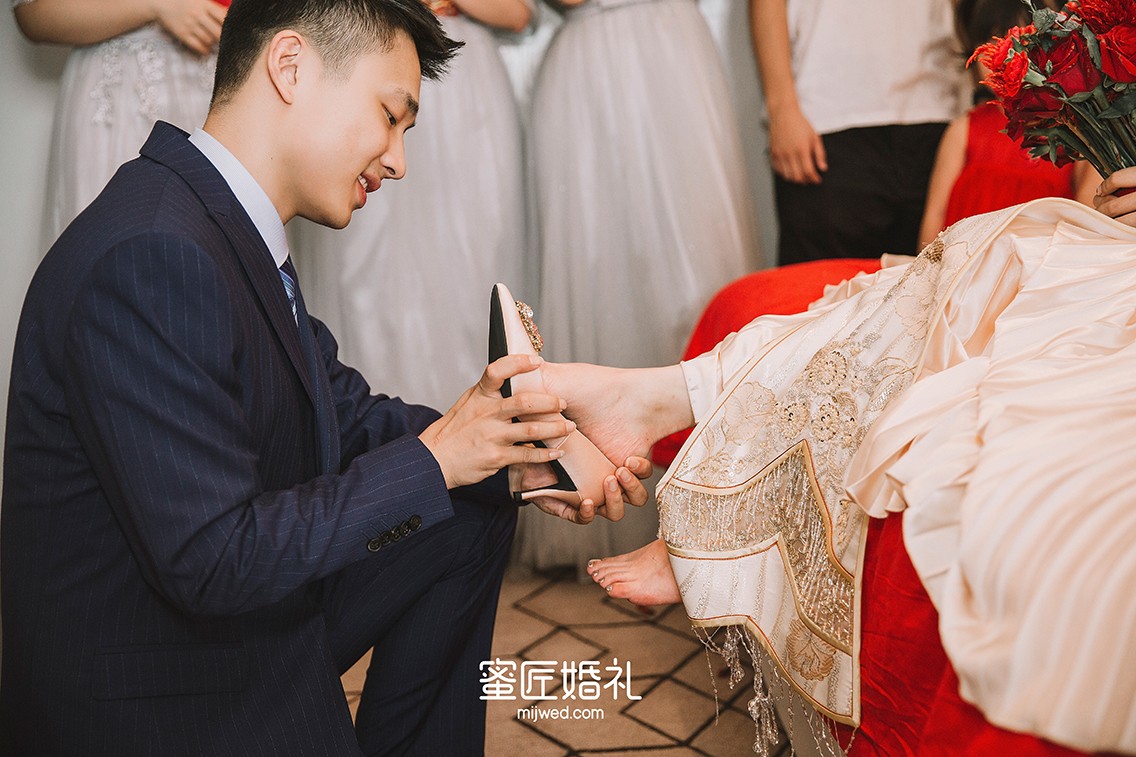 比如男方得到的岳父岳母的认可,进入新娘的房间,这时候新娘的婚鞋早早就被藏了起来,找新娘的鞋子可不是件容易的事,如果找不到,那可就得掏红包了,这个红包不能少,一万零一块是现在的普遍做法,最后还拿走其中的一块,取万里挑一之寓意。