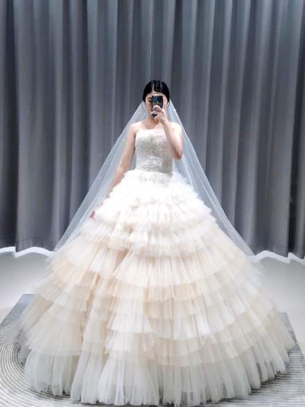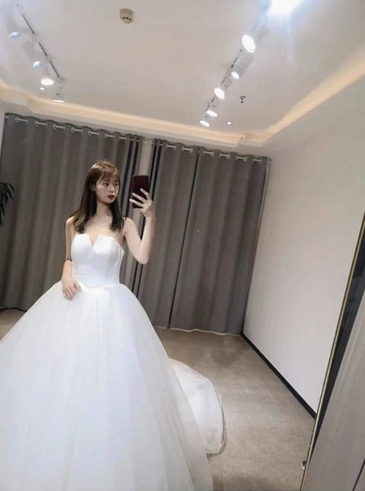 一件主婚纱,我个人是特别喜欢缎面婚纱的,所以一眼就看上了这件无袖纯缎面。婚纱前面是齐地长,后面是大拖尾,特别适合室内婚礼或者大型的[户外婚礼],很有气场,很撑的住场子。虽然样式简洁,但是做工和料子真的特别精细,整个缎面全部有金色暗纹,裙子在灯光下会甚至有些微微发光,的低调奢华有内涵!全身一的装饰就是腰间有两只喜鹊,而且,喜鹊身上的羽毛也是真的!婚纱是拉链款哈,个人认为拉链款比绑带款看着更高级些哈。说了那么多,其实较想说的是:这个婚纱穿上之后,超级无敌显!瘦!穿上之后腰显得超级细!让我这个胖子体会到了90斤的感觉 第二件主婚纱是一件桑蚕丝的轻婚纱,如果说上一件是以大气为主,这件就是实实在在的小清新里透着小性感 (原谅我奇怪的自拍角度)首先,这真的是我见过穿过较轻薄的婚纱了!特别适合小型户外婚礼和海外婚礼,因为很轻方便携带。 上身全镂空[蕾丝]花纹,看着是深V,但是其实胸前是有一层薄纱的(纱是肤色,而且很薄,要凑近才能看得出),所以大家也不用太担心一弯腰就走光啥的哈。下身是桑蚕丝缎面裙,因为上身的花纹已经很精致了,所以下身就没有再多加任何装饰了,依旧看起来很高级。这件婚纱的亮点在背后,整个后背差不多算是全露的,从腰到裙摆,呈一个花瓶形状,也是全镂空。 第三件,是件抹胸裙,也算是轻婚纱,也基本上没什么(原谅我个人比较偏爱这一类型的婚纱)上身在胸口上多了一层薄纱设计,感觉很特别,对小胸妹子也很友好。裙身上是串珠装饰,在灯光下隐隐约约的亮,看着很舒服。下身分为两层,里面那层是缎面,外面加了一层很软很软的薄纱,不像上一件那么贴身,很适合小型户外婚礼,又有一点点小拖尾,但并不浮夸。 较后呢,说下价位,她家是从3k+~5k+不等,这个价钱包含【主婚纱+出门纱+敬酒服+3-4件伴娘服】。如果你有特别喜欢的婚纱,也可以直接定制,不过一定要提前哦2021年07月05日