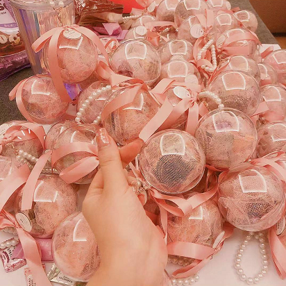 一直想找一款别致好看的喜糖盒,买来自己亲手包喜糖,再发给亲朋好友,更有诚意。也是备婚的一部分,可以拍照记录下来 第一次看到这款,觉得就是它了!完全符合我想要的喜糖盒的样子。很别致,很少女,很仙。包装起来也不麻烦,买的8cm的,能放8-10颗糖。还有透明封口贴,不用担心盒子没盖紧糖会掉出来。搭配在伴手礼里,也很好看。同事还说 很好看很精致符合小公主的气质,哈哈哈。老公也说,秒杀他以前收到的所有喜糖(偷笑)非常满意~ 🍬还另外定制了两个人婚礼logo的金色贴纸贴在上面(因为贴纸比较费时,只有部分好友收到的喜糖盒有贴) 吃完了喜糖,上面的珍珠手串还能别上小玩偶,挂在包包上。[哇R]可爱哦。嘻嘻~[萌萌哒R][萌萌哒R] 🍬一个8cm喜糖盒里可以装:两颗费列罗、一颗百草味牛轧糖、3颗小薄荷糖、2颗好时巧克力。一共8-10颗。喜糖盒里的喜糖要包双数哦,可作参考~[萌萌哒R]2021年05月21日